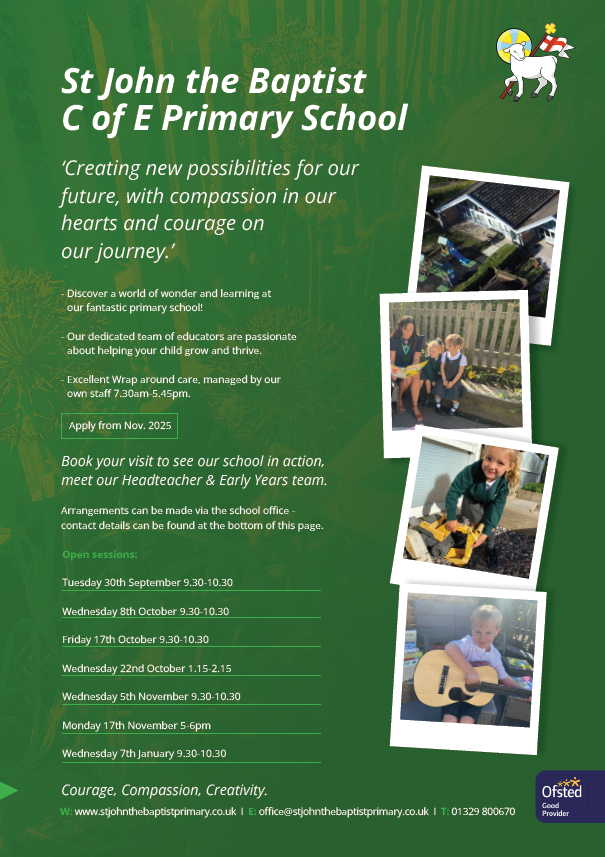 To book a tour or to attend one of our special events (see our open morning flyer below), please telephone our friendly school office team on 01329 800670 or email office@stjohnthebaptistprimary.co.uk