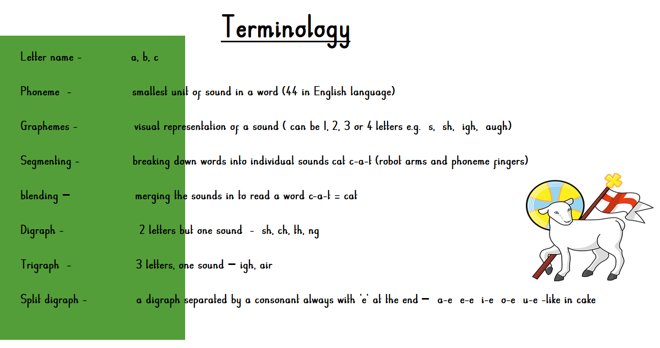 Irregular ‘tricky’ words are taught explicitly, with the tricky part explained. Flashcards are sent home for consolidation.